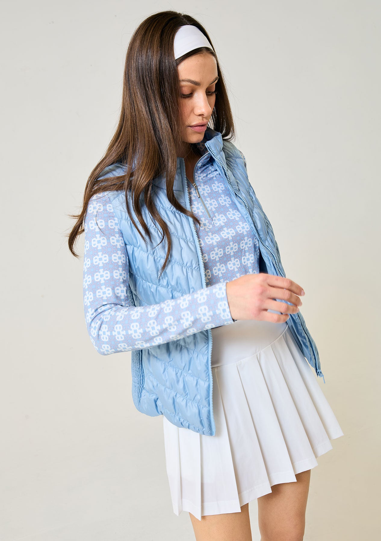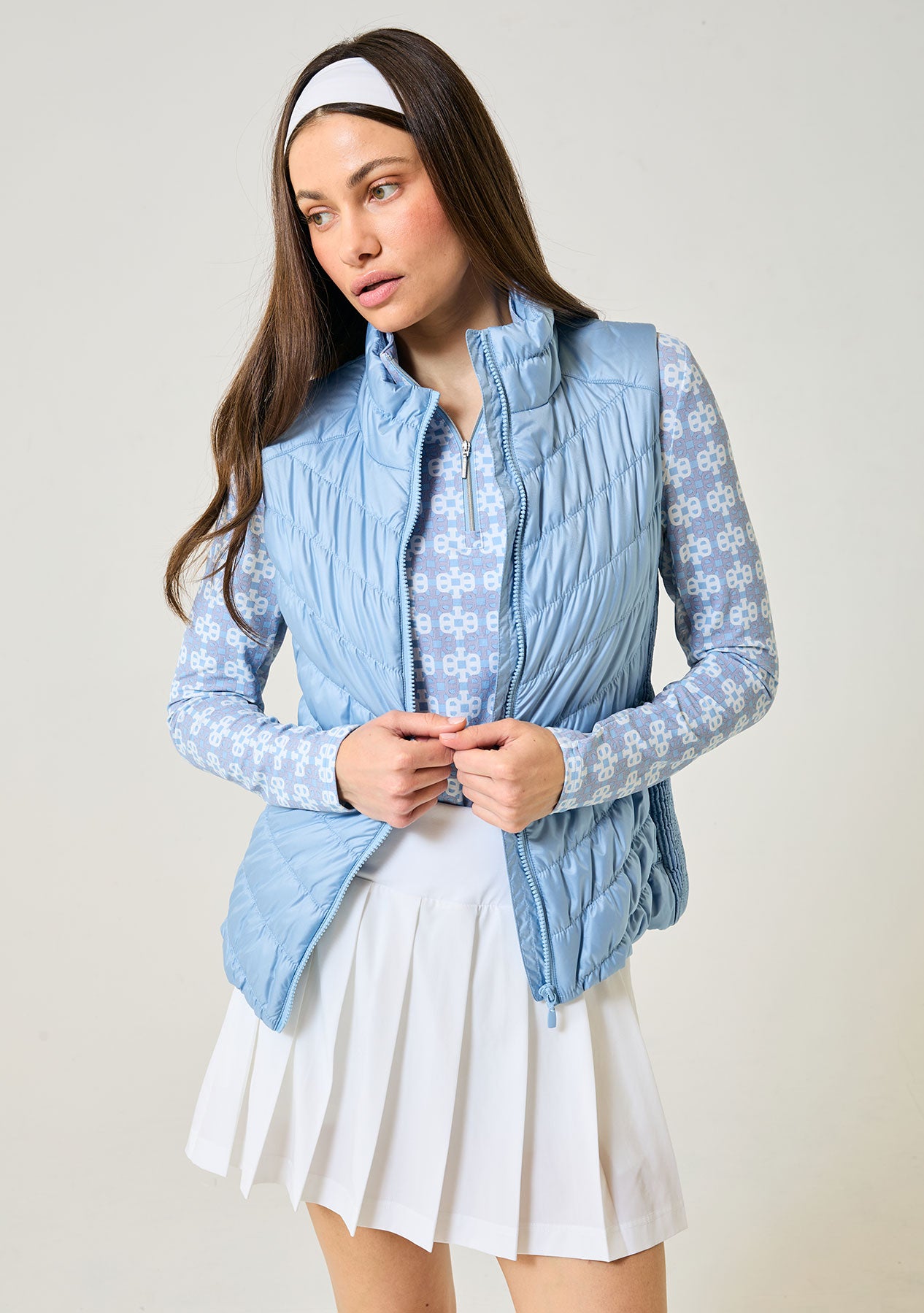 Timeless design meets modern innovation with the Heritage Vest—an elegant layering piece that flatters while it performs. Thoughtfully constructed with an accordion side panel, this vest moves with you and subtly contours to highlight your natural shape, creating a feminine silhouette without compromising comfort. Lightweight yet protective, the Heritage Vest is designed for versatile wear on the course, during travel, or layered for everyday sophistication.